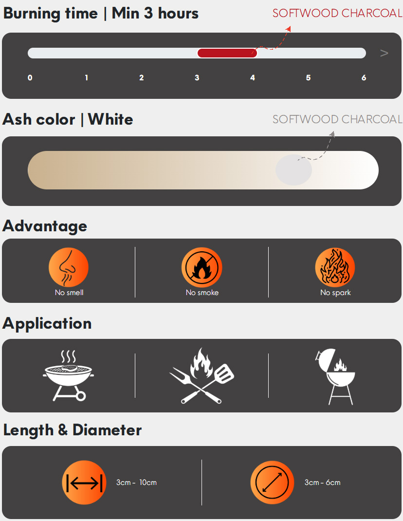 Softwood Charcoal is made from abundant softwood sources, making it a sustainable and cost-effective choice for everyday cooking. Produced from natural raw wood without chemicals or additives, it burns cleanly while keeping your food safe and flavorful.